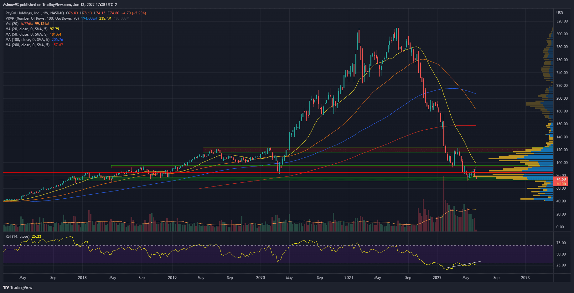 Týdenní graf akcie PayPal