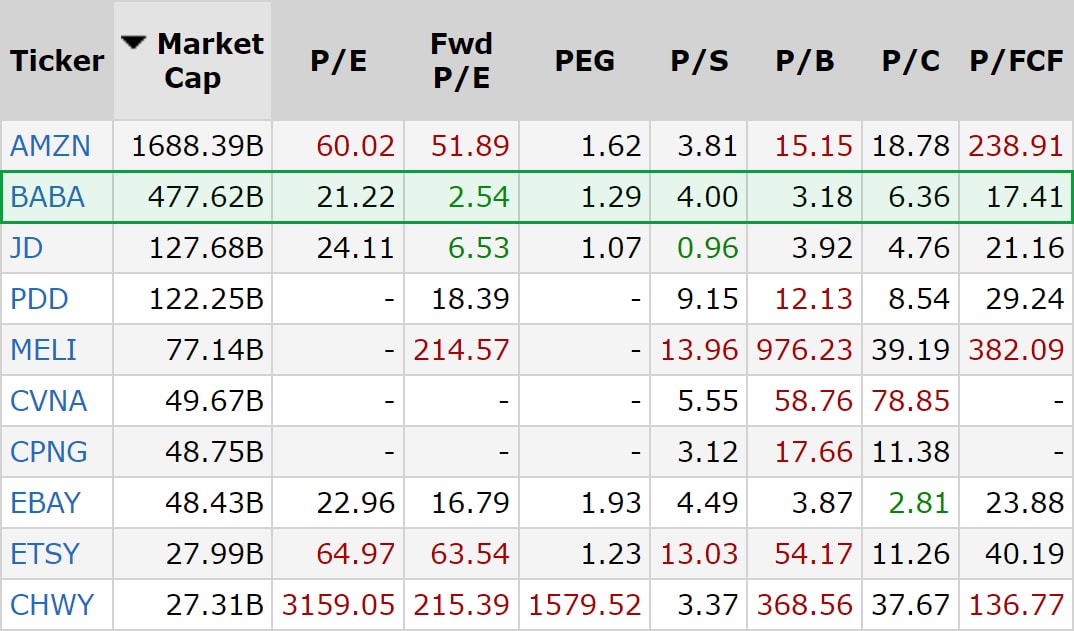 Akcie Alibaba lze považovat z hlediska tradičních oceňovacích měřítek (P/E ratio, P/B ratio atd.) za poměrně levné. V porovnání se svými konkurenty z obou stran Pacifiku patří mezi “nejlevnější” ve většině hojně sledovaných oceňovacích metrikách, jak můžete vidět v tabulce níže.