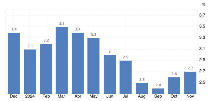 Včerejší nadšení bylo podpořeno očekáváním snížení úrokových sazeb Federálního rezervního systému, které podnítily nejnovější údaje o inflaci. Index spotřebitelských cen (CPI) vykázal v listopadu meziroční nárůst o 2,7 %, což je o něco více než říjnových 2,6 %.