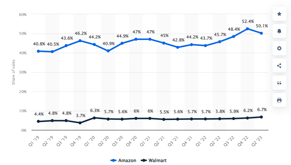 Vývoj podílu tržeb Amazonu a Walmartu na e-commerce trhu v USA
