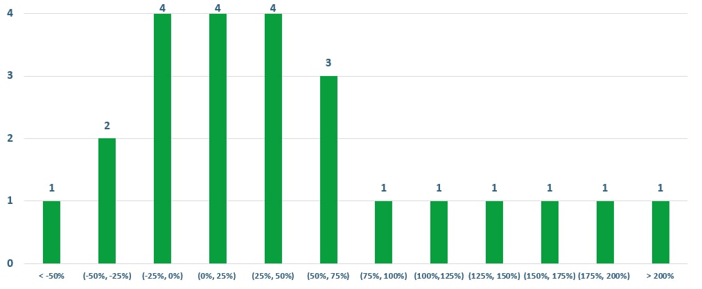 Následující tabulka ukazuje rozložení ročních výnosů akcií Amazon od konce 90. let. Prvním zjištěním je, že výkonnost ceny akcií byla v průběhu let značně nevyzpytatelná. V roce 1998 akcie stouply o téměř 1 000 % a v roce 2000 se propadly až o 80 %.