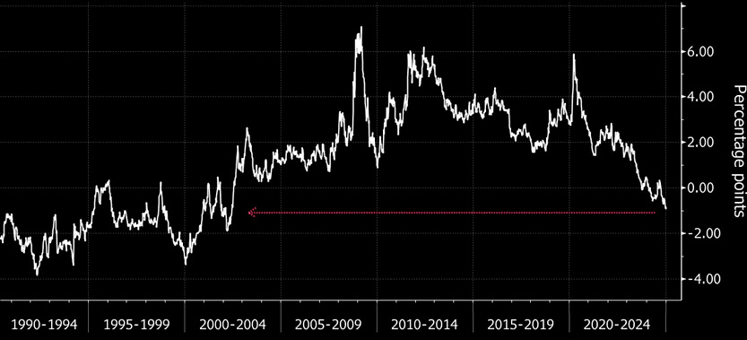 To znamená, že rozdíl mezi nimi, měřítko takzvané rizikové prémie za akcie neboli dodatečné kompenzace investorovi za riziko spojené s vlastnictvím akcií, klesl do záporných hodnot.