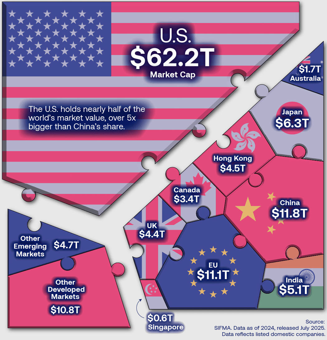 Podle SIFMA (americká asociace cenných papírů a finančního průmyslu) tvoří americké akcie 49,1 % zhruba 126,7 bilionu USD globální kapitalizace, tedy asi 62,2 bilionu USD, což je zhruba 5,3× více než druhá Čína.