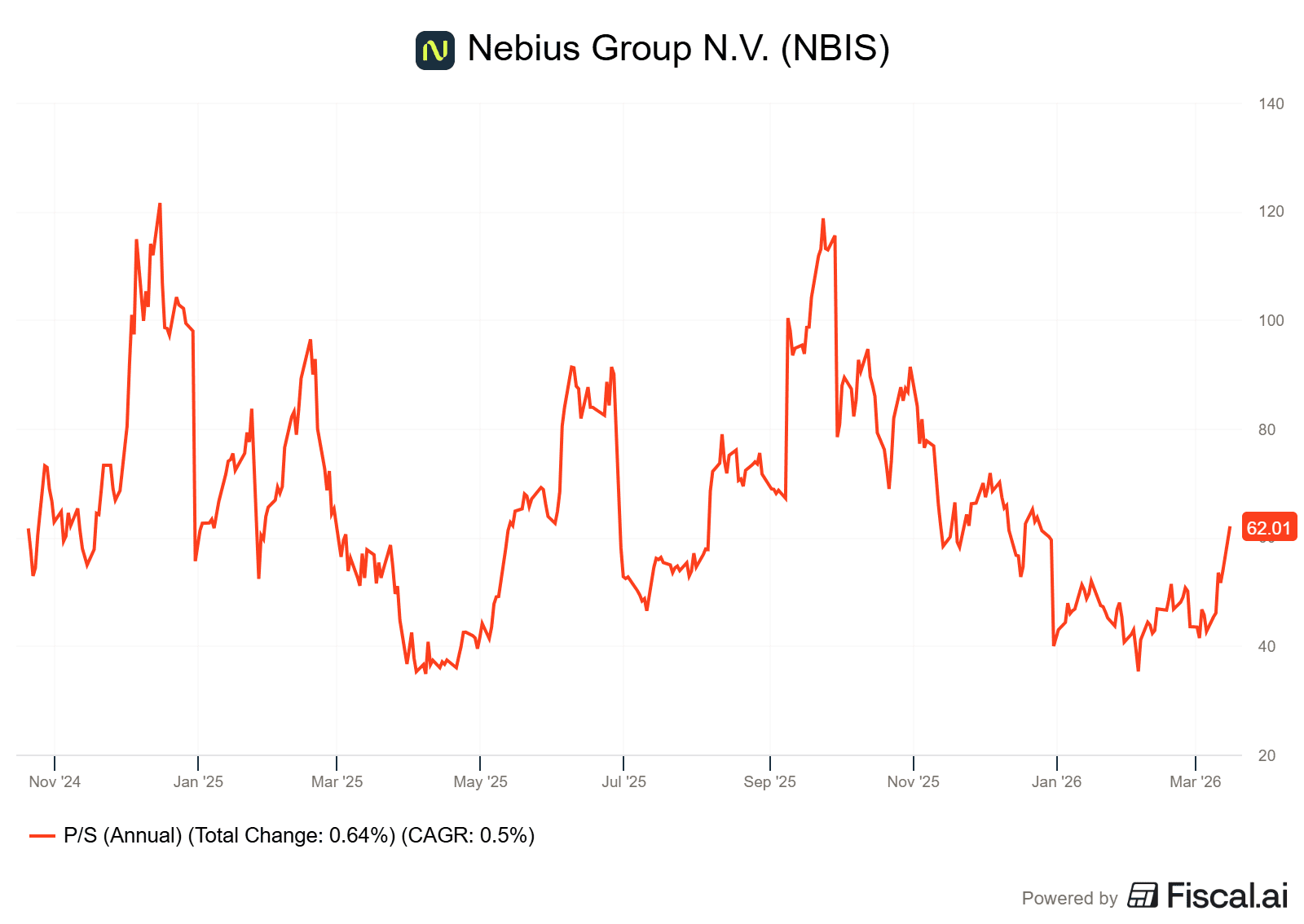 Při pohledu na standardní metriky je Nebius poměrně drahý. Akcie se obchodují při ukazateli P/S na hodnotě 62. Investoři tak v praxi platí 62 dolarů za každý jediný dolar ročních tržeb podniku.
