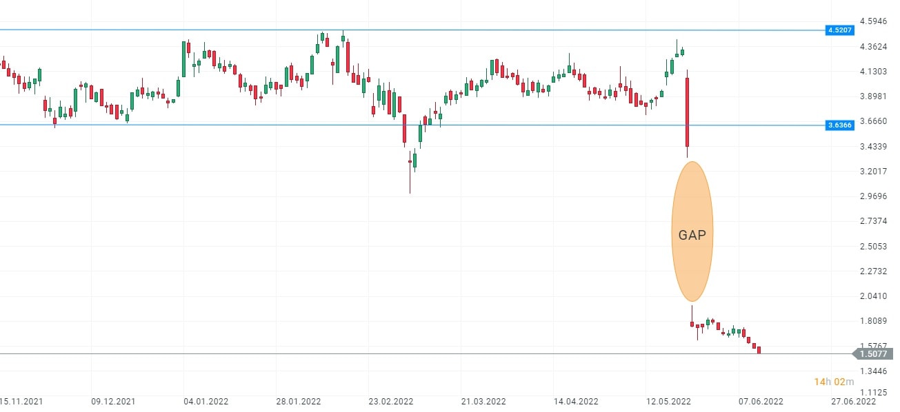 Letecká společnost Air France-KLM zažila největší propad svých akcií v historii společnosti. Na cenu okolo 1,5 EUR je srazila zpráva o emisi nových akcií, jejichž prodejem má společnost uhradit část dluhu vůči státu, který jí byl poskytnut v období pandemie. Společnost zároveň poskytla stávajícím investorům přednostní právo na nové akcie, které bylo proplaceno ve formě nezdanitelné dividendy. Neuzavřený prodejní Gap na cenovém grafu svědčí o stále přetrvávající negativní náladě investorů.