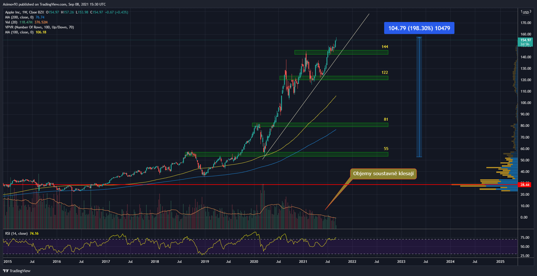 Technickou analýzu si zpracujeme na týdenním grafu, abychom měli i dlouhodobější pohled. Akcie Apple se od roku 2009, tedy po poslední krizi, zhodnotily asi o 5 000 %. Od toho covidové propadu cena stihla vzrůst o téměř 200 %, což je samozřejmě horentní číslo. Struktura trhu tomu i odpovídá. Když bych “odzoomoval”, šlo by více vidět, že máme před sebou ryzí parabolický růst.