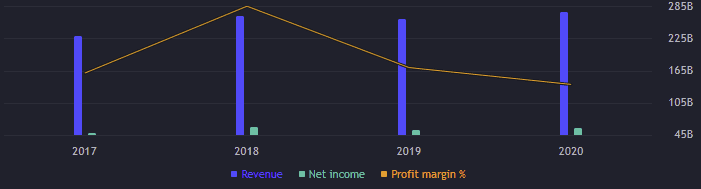 Za předešlý rok byly výnosy rekordní – 274 miliard USD. Při profit marginu 21 % bylo dosaženo zisku 57,41 miliardy USD. I přestože v roce 2018 byl výnos skoro o 10 miliard vyšší, zisk dosáhl 59,5 miliardy USD. Protože profit margin byl o něco větší – 22,4 %.