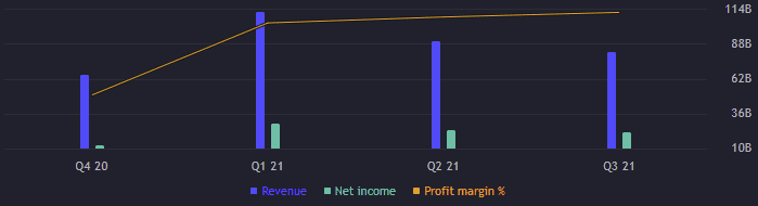 Díky klesajícím výnosům, ale čistý zisk za předešlá dvě čtvrtletí klesá. Za první o téměř 18 % a za druhý zhruba o 8 % na 21,74 miliardy USD. Provozní výnosy též klesají, mezikvartálně o 14 % na 24,29 miliardy USD. EBITDA je na 27,12 miliardách USD. Volné cash flow kleslo o 12,5 % na 19 miliard USD.