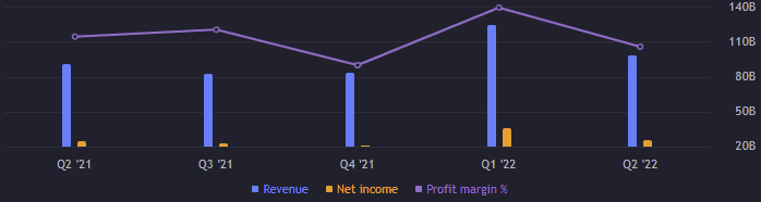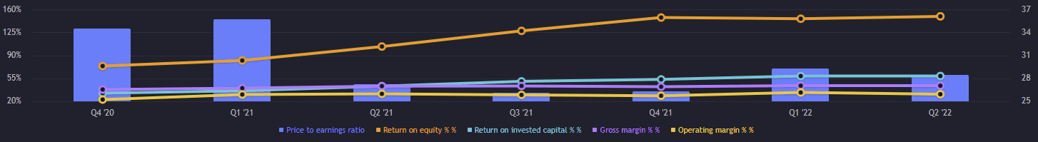 Zisk na akcii (EPS) je 1,52 bodů. Ukazatel P/E byl k druhé účetnímu čtvrtletí 28,4 bodů. Avšak díky posledním kurzovým propadům akcie Apple, je nyní P/E něco přes 23 bodů. Tak nízké P/E jsme tu neměli od roku 2019. Rentabilita vlastního kapitálu (ROE) je více jak 149 %. Rentabilita na investovaný kapitál (ROIC) činí 58,5 %.