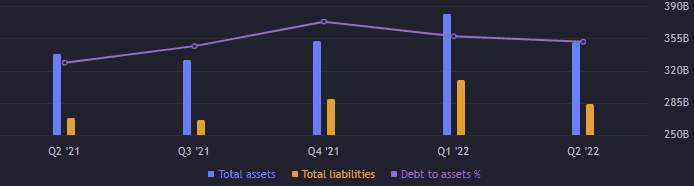Poměr dluhu vůči vlastnímu kapitálu D/E je 1,78 bodů. Ten poměr je nepřekvapivě vyšší – už z vysokého ROE člověk může poznat, že podnik nejspíš využívá větší finanční páky (úvěry). Celkovýdluh je skoro 120 miliard USD. Poměr dlouhodobého dluhu vůči celkovým aktivům je 0,29 bodů.