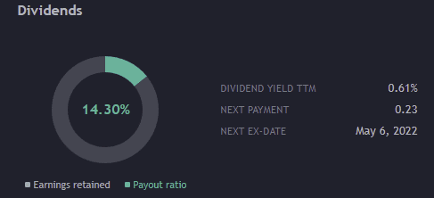 Apple vyplácí dividendu, což je informace, která se v souvislosti s tímto titulem příliš neřeší. Proč? Ta dividenda je totiž velminízká. Vlastně je to pouze takový malýbonus ke kapitálovým výnosům. Běžný výnos ve formě dividendy dosahuje pouhých 0,61 %. Což je dáno dividendovou politikou Applu, kdy se ze zisku momentálně vyplácí pouze 14,3 %. Zas na druhou stranu, je to 0,6 % ročně takřka zadarmo.