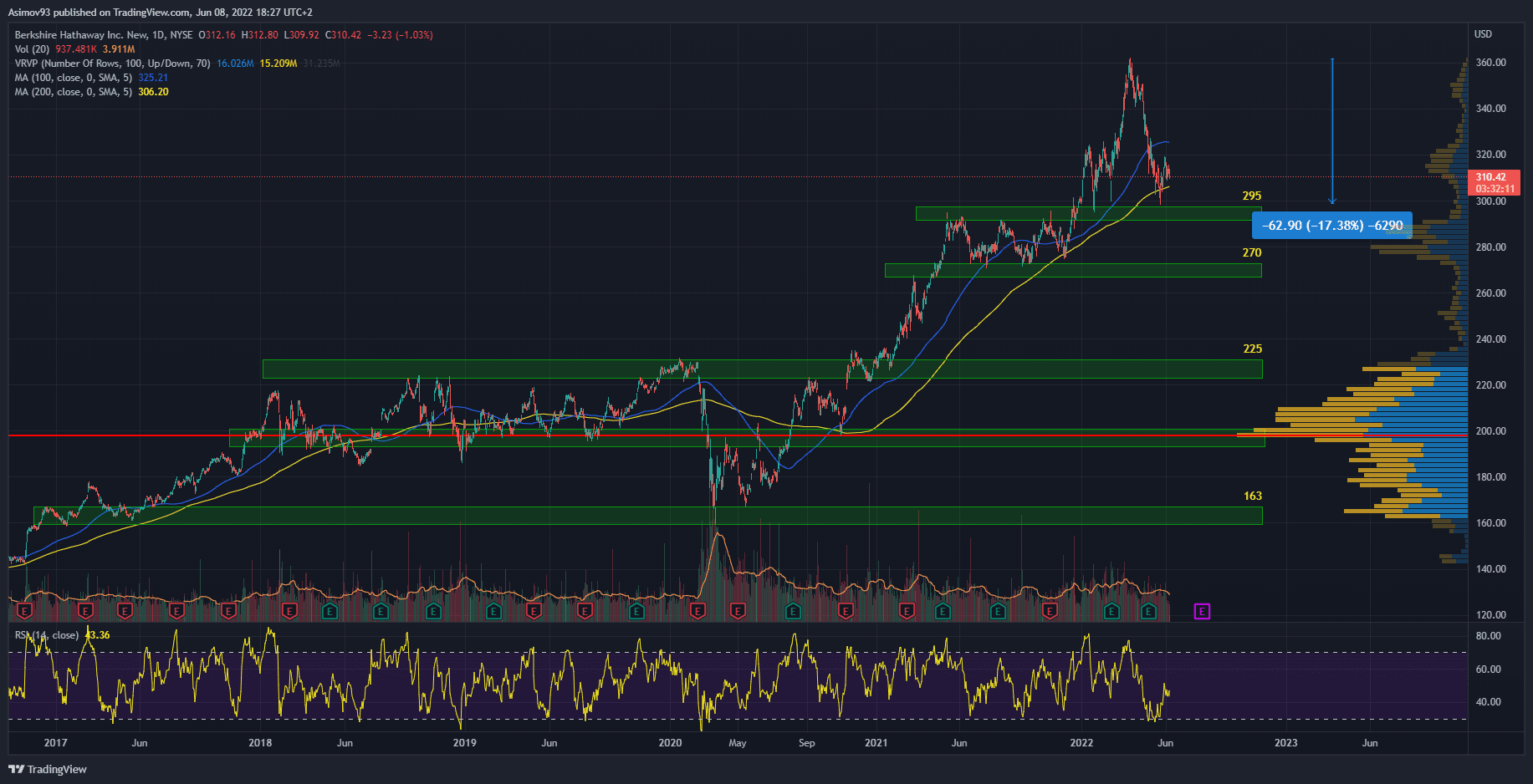 Vzhledem k tomu, že na akciovém trhu začíná medvědí trh, postihne to samozřejmě i Berkshire. Avšak ta stabilita akcionářům zajistí, že titul během současného obchodování (pravděpodobně) neklesne na ceně tolik jako třeba různé růstové akcie. Během předešlé finanční krize ztratily akcie Berkshire Hathaway zhruba 55 %. Když se tedy bude historie rýmovat, potenciální tržní dno lze odhadovat již kolem S/R pásma 163 USD. Což je zároveň tržní dno z března 2020.