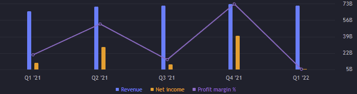 Takže společnost Berkshire Hathaway zaznamenala za první čtvrtletí obrat v hodnotě 70,81 miliardy USD, což je mezikvartálně mírný pokles o 1,4 %. V meziroční podání se jedná o růst téměř o 10 %. Provozní zisk mezikvartálně klesl o 1,17 % na 8,73 miliardy USD. Meziročně je to pokles o 2 %. Čistýzisk je ve výši 5,46 miliardy USD. Mezikvartálně pokles o horentních 86 % z 39,65 miliardy USD. Meziročně o více jak 53 %. EBITDA dosahuje 11,44 miliardy USD. Mezikvartálně je to zase mírný pokles o 0,91 %.
