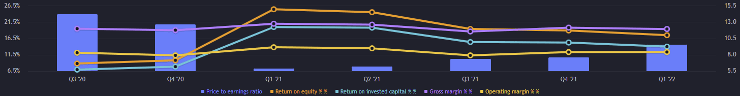 Zisk na akcii (EPS) je 2,47 bodů. Ukazatel P/E byl ke konci prvního čtvrtletí 9,5 bodů. Nyní je na 8,4 bodech. Rentabilita vlastního kapitálu (ROE) dosahuje 17,5 %. Rentabilita na investovaný kapitál (ROIC) činí téměř 14 %.