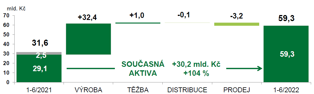 Provoznívýnosy za celé první pololetí dosáhly hodnoty 130,5 miliardy korun, meziročně o 21 % více. EBITDA za celé pololetí vzrostla o 88 % na 59,3 miliardy korun. Na tom se největší měrou podílel segment VÝROBA (+32,4 miliardy korun). Na růstu řečeného segmentu má primárně svůj díl extrémní růst tržních cen komodit na velkoobchodním trhu a vliv vyššího prodeje a aktivace podpůrných služeb v ČR (21,5 miliardy korun). Na druhém místě jsou zisky z obchodování na zahraničních trzích (+7,1 miliardy korun). A na třetím místě dočasné vlivy (+3,7 miliardy korun).