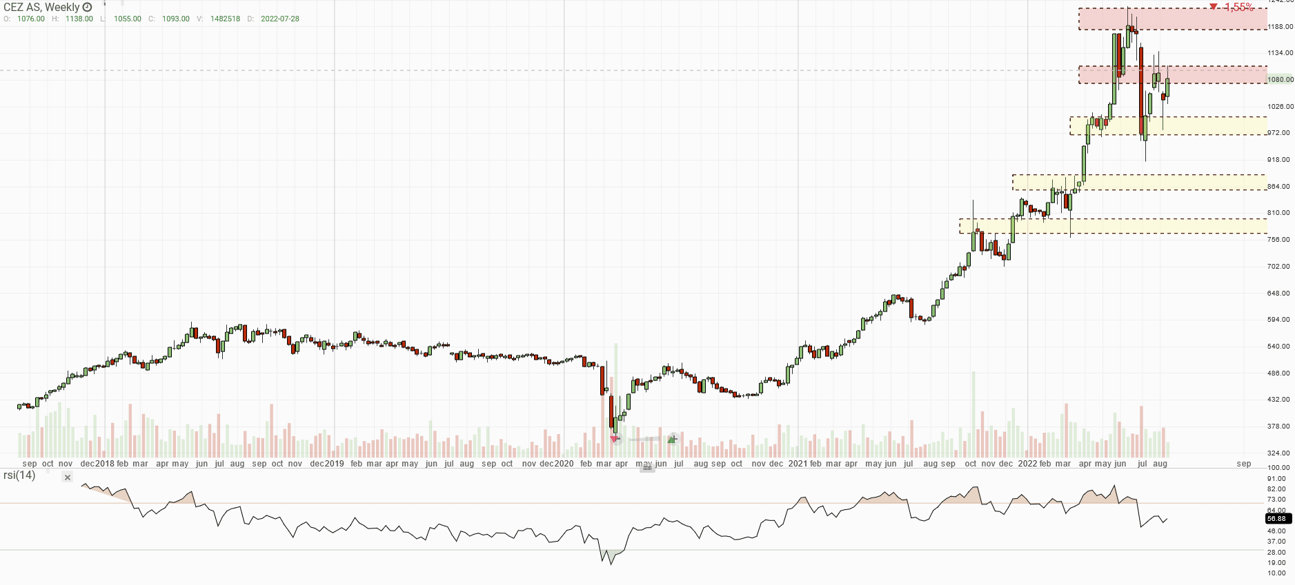 Akcie ČEZ musely v posledních několika týdnech čelit vůbec prvním větším propadům. Když bychom to měli vztáhnout na předešlé zprávy, začalo se hodně mluvit o sektorové dani a o dani z nadměrných zisků. Což nejsou úplně příznivé zprávy pro tituly jako je ČEZ.