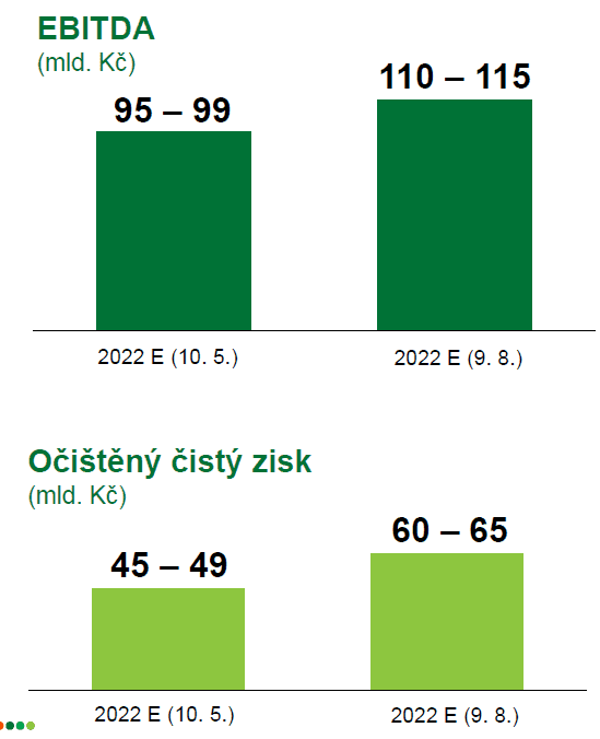 Skupina ČEZ zásadně upravila svůj výhled pro celý rok 2022. Úroveň EBITDA se posunula z intervalu 95-99 na 110-115 miliard korun. Zatímco výhled pro čistý zisk se posunul z intervalu 45-49 na 60-65 miliard korun. Důvodem jsou vyšší realizační ceny elektřiny, vyšší zisk z obchodování s komoditami na zahraničních trzích a vyšší disponibilita jaderných zdrojů.