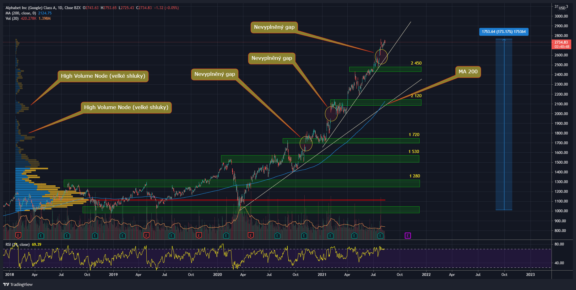 Nyní provedeme technickou analýzu, k čemuž nám poslouží denní graf akcie Google. Rovnou mohu uvést, že od března 2020 se titul zhodnotil o 173 %, což je dost horentní číslo.