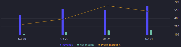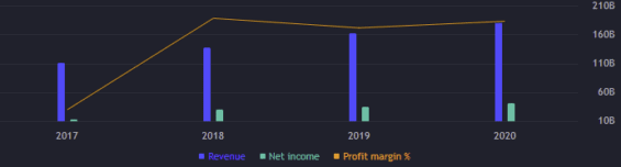 Čistý výnos dělá za rok 2020 přes 40 miliard USD, meziroční navýšení o 17,26 %. Z pohledu volného cash flow si firma též náramně polepšila. O více jak 38 % na 43 miliard USD. EPS je za rok 2020 58,61 bodů. Poměrový ukazatel P/E skoro 30 bodů a ROE 19 %, což je přijatelné.
