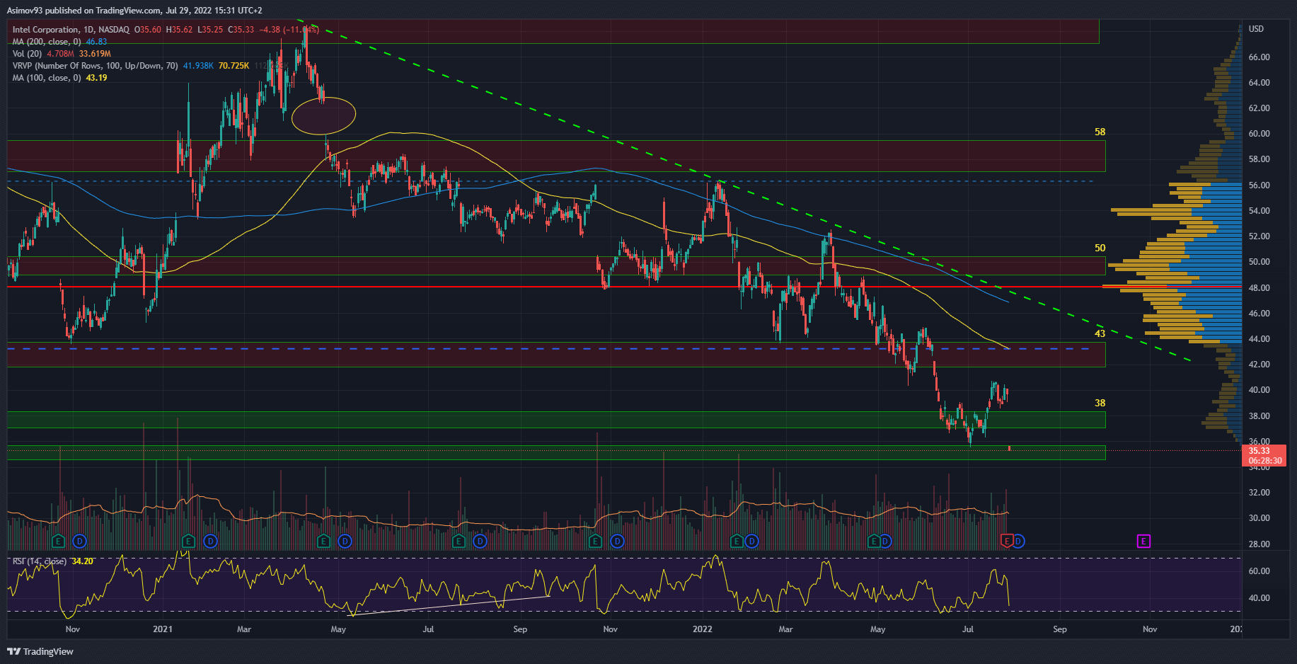 Je další pokles nevyhnutelný? Investoři se z trhů obecně vzato stahují. Intel má dlouho problémy v podobě zaostávání před svou konkurencí. Jinak je to fundamentálně skvělá společnost. Ale cenový pokles bude pokračovat. Přesněji řečeno aktuální klesající trend přetrvá. Ačkoliv aktuální ceny už jsou řekněme dosti lákavé. Od historického maxima jsme téměř 50 % dole. A akcie Intel pod cenou 30 USD budou velmi lukrativní.