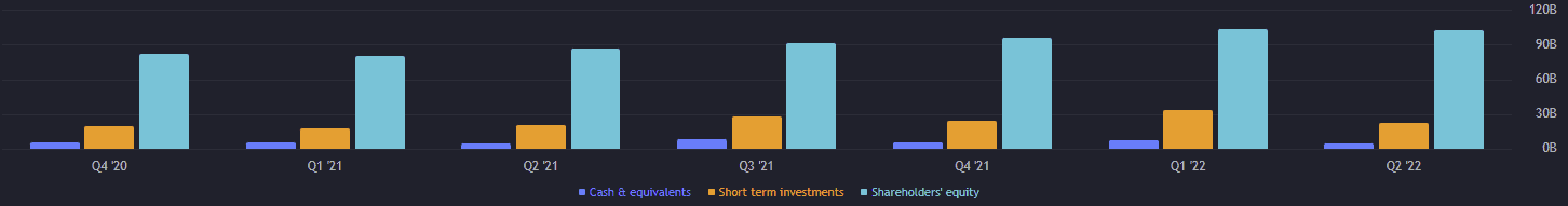 Celkováaktiva firmy představují přes 170 miliard USD, které meziročně stouply o více jak 10 %. Celkovézávazky dosahují 69,2 miliardy USD. Čili vlastní kapitál je 101,22 miliardy USD. To implikuje meziročně růst o skoro 19 %. A právě vlastní kapitál firmy meziročním tempem stoupá v dvojciferných číslech.