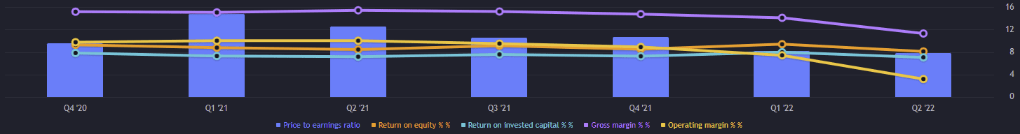 Zisk na akcii (EPS) je -0,11 bodů. Ukazatel P/E je na úrovni 7,8 bodů. Tak nízko se titul za předešlou dekádu snad nenacházel. Lidově řečeno jsou akcie Intel nyní vskutku levné. Rentabilita vlastního kapitálu (ROE) je ve výši 20,5 %. Rentabilita na investovaný kapitál (ROIC) přesahuje 15 %. Oba ukazatele již dva roky soustavně klesají.