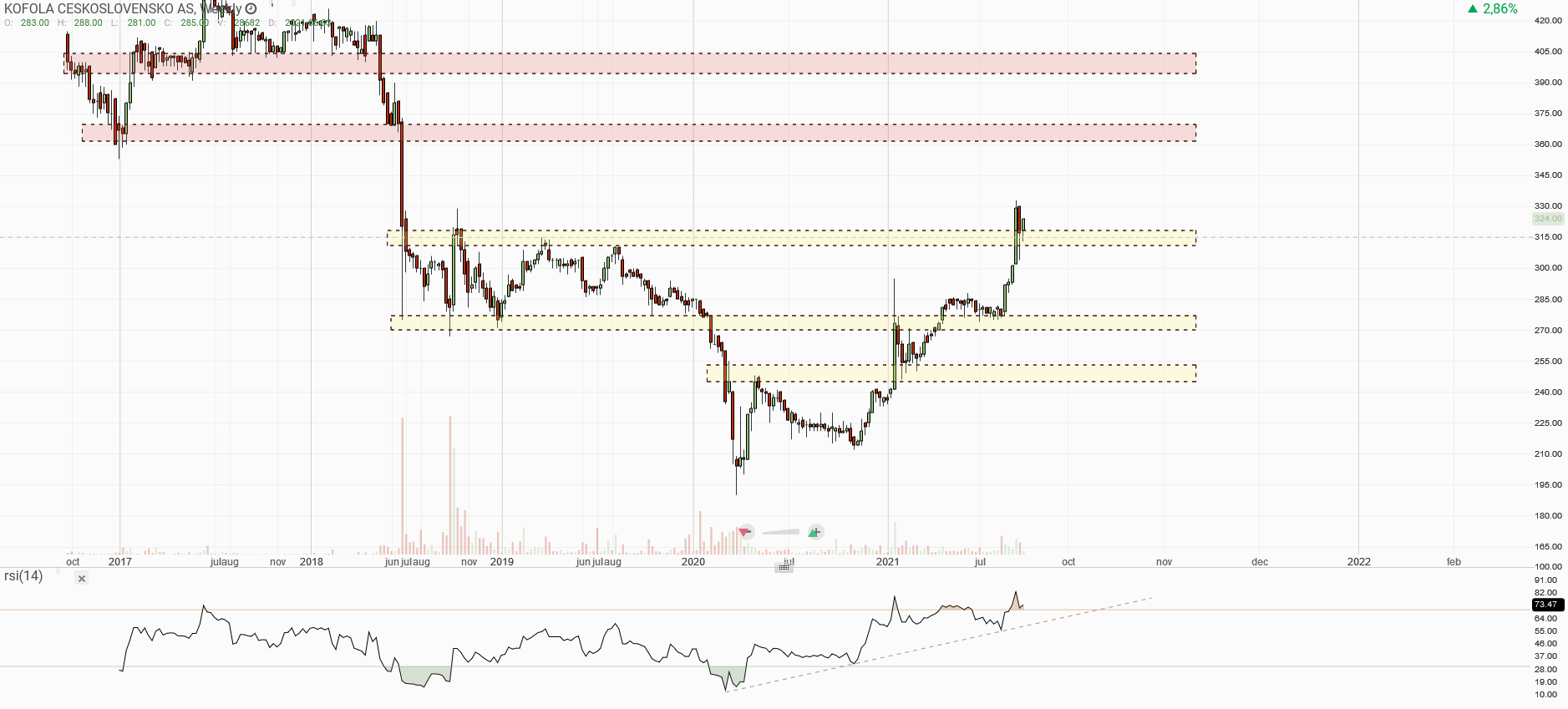 Tím chci říct, že zde nejsou prakticky žádné překážky, které by expanzi bránily. Pro Kofolu je ovšem zásadní, aby si support 315 korun udržela. Pokud se nic radikálně nezmění, trh akorát zkonsoliduje a pak může zase pokračovat v cenovém růstu.
