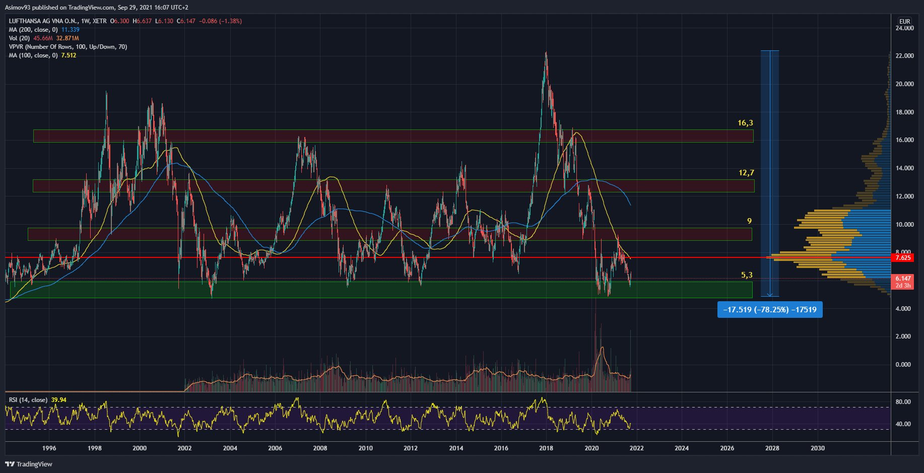 Z historického Price Action můžeme bez debat vydedukovat, že je mnohem větší pravděpodobnost, že přijde silný odraz. Může to však nějakou dobu trvat. Pokud ale support padne, pravděpodobně v žádném případě nechcete akcie Lufthansa vlastnit. Osobně bych takový propad interpretoval jako blížící se bankrot společnosti.