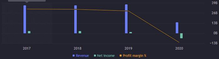 Výnosy v roce 2020 klesly extrémně, o 63 % na 13,59 miliard EUR. Profit margin spadl do propasti, téměř -50 %. Provozní výnos se propadl o šílených 769 % na -6,15 miliardy EUR. EBITDA klesla o 199 % na -3,59 miliardy EUR. Volné cash flow bylo po letech poprvé záporné, -3,68 miliardy EUR.