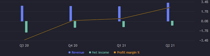 Lufthansa první tři znázorněné kvartály generovala výnos lehce nad 2,5 miliardy EUR. Druhý kvartál letošního roku činil výnos 3,21 miliardy EUR při profit marginu -23,54 %. Tudíž výsledný zisk byl záporný. Lufthansa totiž od počátku pandemie z roku 2020 negeneruje žádný zisk, čili je ztrátová. Situace se dle grafu ovšem postupně lepší.
