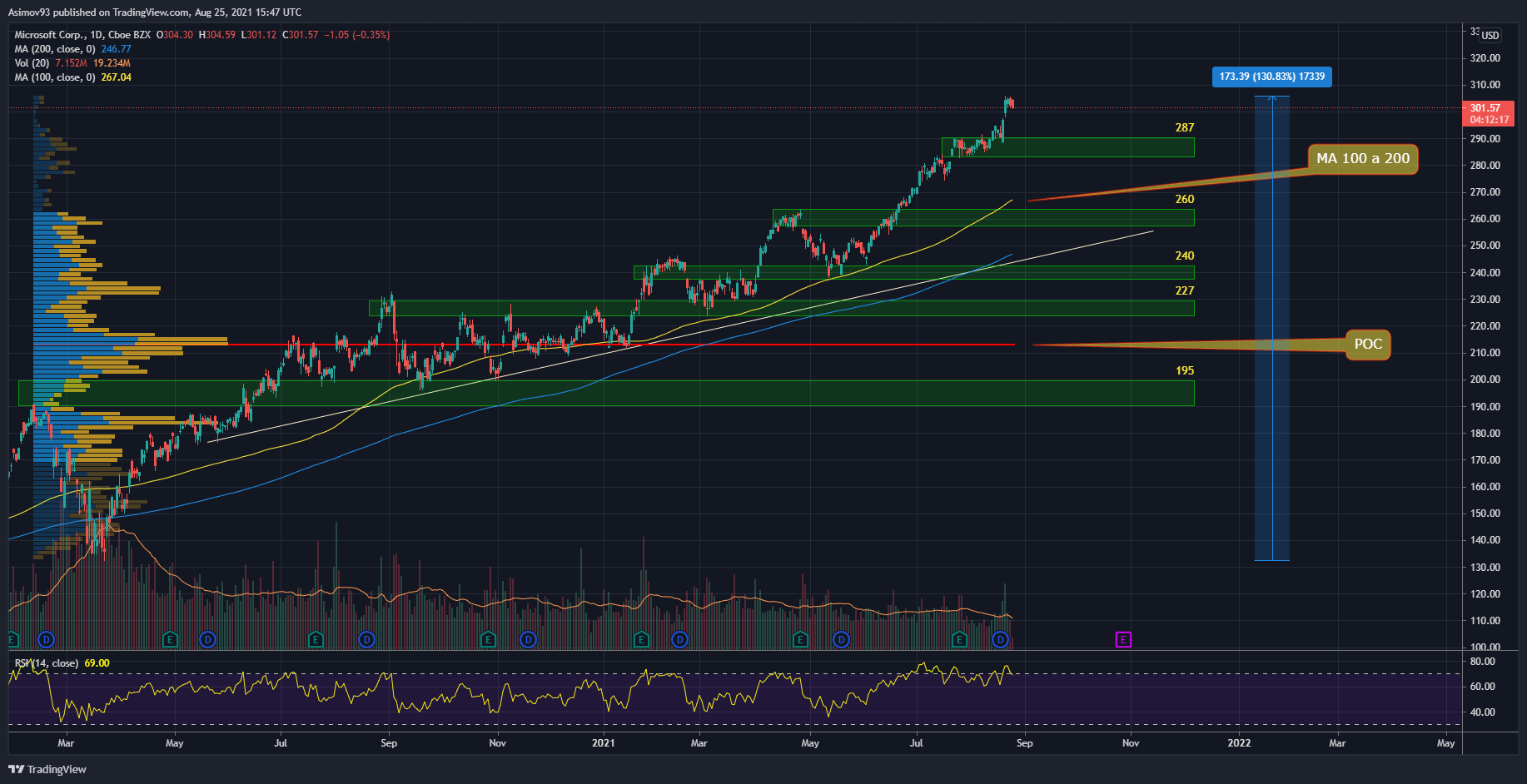 Na denním grafu jsem zaznačil všechny dostupné supporty až k S/R levelu 195 USD. Nejbližší je S/R hladina 287 USD, pak až 260 USD. Dynamické supporty jsou klouzavé průměry – MA 100 a 200. Pokud cena půjde dolů, vyplatí se oba klouzavé průměry sledovat. Co se týká objemového profilu, počátek je na únorovém vrcholu z roku 2020.