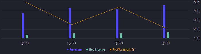 Provozní výnosy jsou za rok 2021 téměř 70 miliard USD, meziročně růst o 32 %. EBITDA je 80,82 miliardy USD, meziročně skok o skoro 24 %. Volné cash flow dosáhlo 56,12 miliardy USD a dle údajů z předešlých let, stabilně roste. EPS je za celý rok 2021 8 bodů. ROE a P/E je stejné jako u Q2, protože se ukazatele počítají z posledních 12 měsíců.