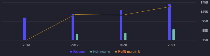 Jak vyplývá z grafu, poslední roky Microsoftu rychle stoupají výnosy. Jenom za účetní fiskální rok 2021 činil celkový výnos 168 miliard USD. Profit Margin byl 36,45 %, což společnosti přineslo zisk v hodnotě 61,27 miliardy USD. Meziročně zisk stoupl o 17,53 %.