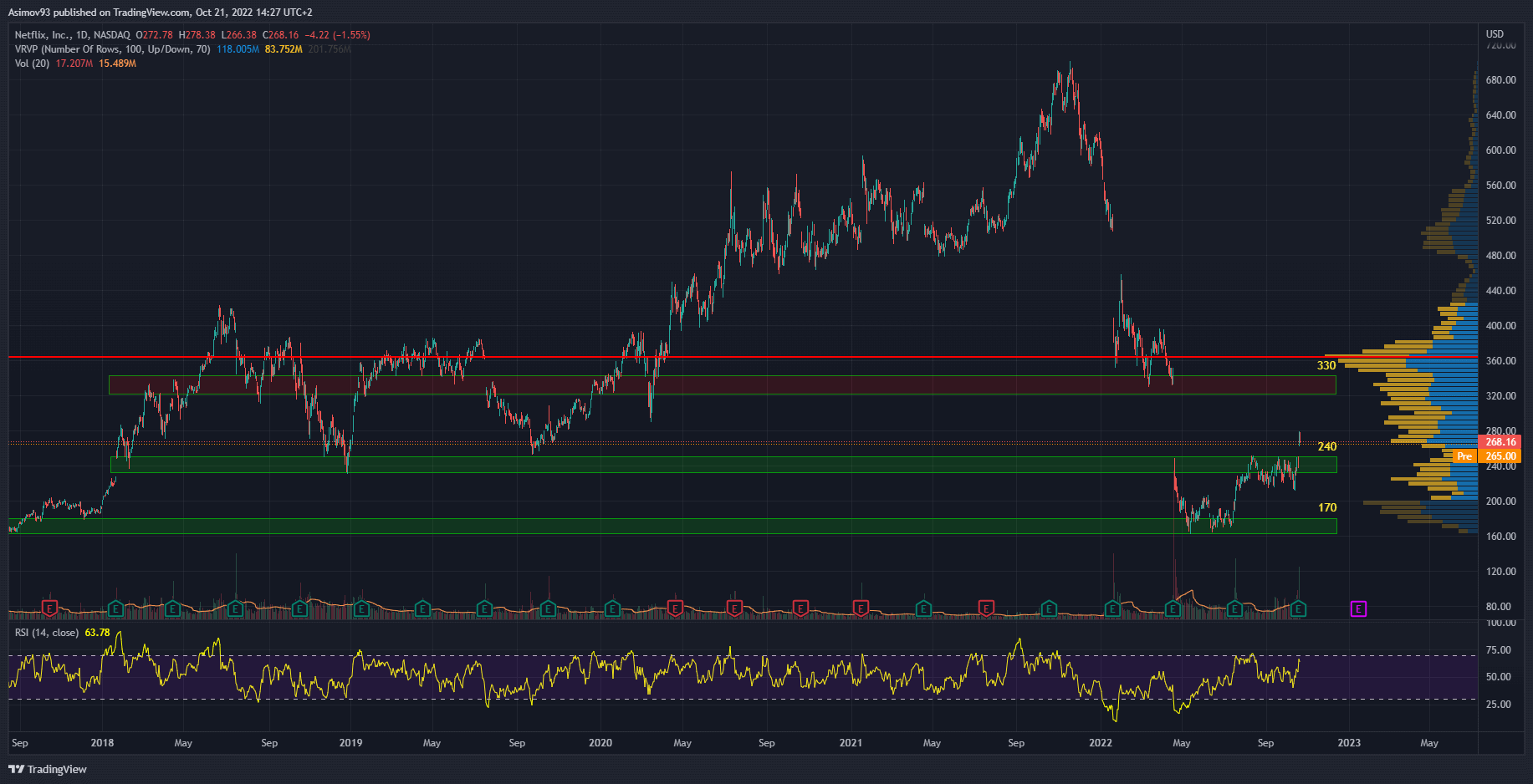 Akcie Netflix šly od konce listopadu 2021 dolů jako na horské dráze. Během tohoto pohybu se v grafu vytvořily dva gapy, kdy ten druhý byl vážně široký. Od S/R levelu 330 USD až po S/R level 240 USD. Čím větší tyto gapy jsou, tím více fungují pro kurz jako magnet. Proto dávalo smysl, aby trh alespoň tu druhou mezeru zaplnil. Což de facto po zveřejnění earnings začalo.