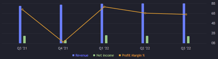 Hrubá marže je za třetí kvartál 36,82 %. Jeden z nejslabších výsledků za sledovaná čtvrtletí. Provozní marže je 19,34 %. Jedna z nejslabších, ale až nějak extrémně se nevymyká. Čistá marže je 17,64 %, což patří k těm slabším výsledkům.