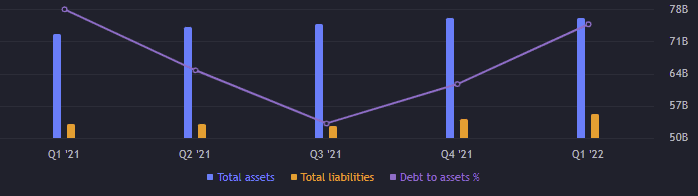 Poměr dluhu vůči vlastnímu kapitálu D/E je 0,44 bodů a poměr dlouhodobého dluhu vůči celkovým aktivům činí 0,12 bodů. Oba ukazatele jsou proto na přijatelných úrovní. Celková aktiva jsou na úrovni 75,81 miliardy USD, zatímco celkové závazky dosahují 55,2 miliardy USD. Celkovývlastní kapitál dělá 20,6 miliardy USD. Celkovýdluh představuje 8,81 miliardy USD.