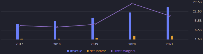 Obrat je za celý rok 2021 více jak 25,5 miliardy USD, meziročně růst o 19,25 %. Výnosy rostou tímto tempem vcelku standardně. Provozní zisk si polepšil o 32,45 % na 4,51 miliardy USD. Čistý zisk dělal 4,17 miliardy USD, žádná změna oproti roku 2020. Mimochodem roky 2020 a 2021 jsou oproti létům předcházejícím skutečně rekordní. EBITDA je 5,78 miliardy USD, mezikvartálně vzestup o horentních 25,7 %. Volné cash flow je přes 5,43 miliardu USD.