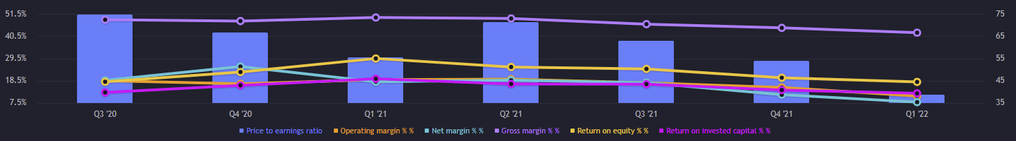 Zisk na akcii (EPS) dosáhl 3,52 bodů. Poměrový ukazatel P/E je za rok 2021 53,65 bodů. Hodnota, která je mezi lety 2017 až 2021 vlastně standard. Rentabilita vlastního kapitálu (ROE) činila necelých 20 %. Rentabilita na investovaný kapitál (ROIC) je téměř 14 %.