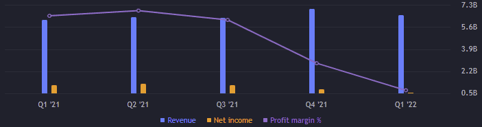 Pojďme se konečně podívat na čtvrtletní výsledky. Dá se říct, že “vstupní” kvartál do nového roku příliš nevyčníval – v negativním i pozitivním smyslu. Obrat je za první čtvrtletí 6,44 miliard USD, což je mezikvartálně pokles o téměř 7 %. Meziročně je to růst o cca 5,5 %. Provoznízisk však rapidně klesá, za první čtvrtletí je 700 milionů USD. Mezikvartálně provoznízisk padl o 33,33 %, meziročně o téměř 40 %. Pravděpodobně je drtí inflace, která jim zvyšuje náklady.