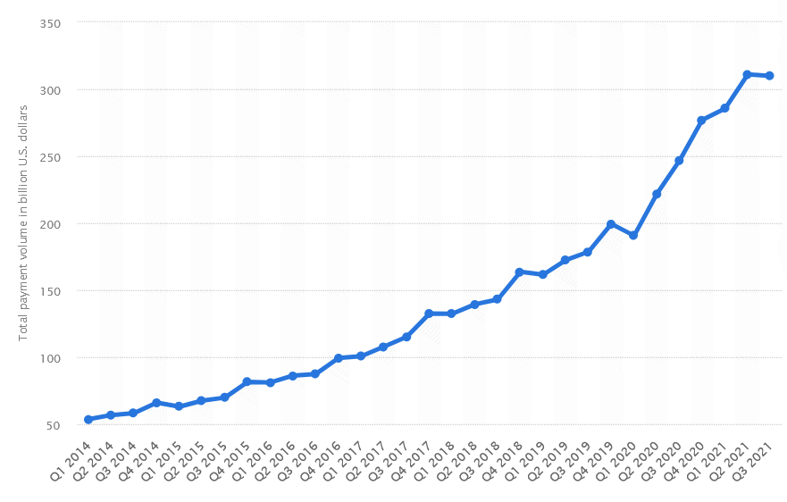 PayPal se může chlubit rychlým růstem objemů (total payment volume – TPV), které tento fintech dokáže zpracovat. Jenom za celý rok 2021 PayPal zpracoval platby v celkovém objemu 1,25 bilionu USD – meziročně růst o 33 %. Za první kvartál letošního roku to činí 323 miliard USD, což je meziročně vzestup o 13 %.