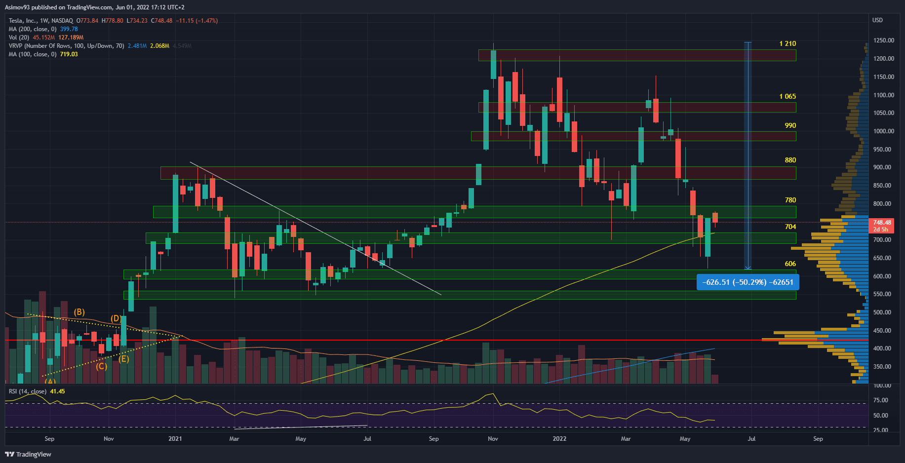 Každopádně S/R levely 606 USD a 551 USD jsou hladiny, které jsou na základě price action z minulého roku spolehlivé. Respektive není žádné překvápko, že máme lokální tržní dno zrovna na S/R levelu 606 USD. Zde nastal slušný odraz, který kurz dostal zpátky nad 100týdenní klouzavý průměr a do těsné blízkosti S/R hladiny 780 USD.
