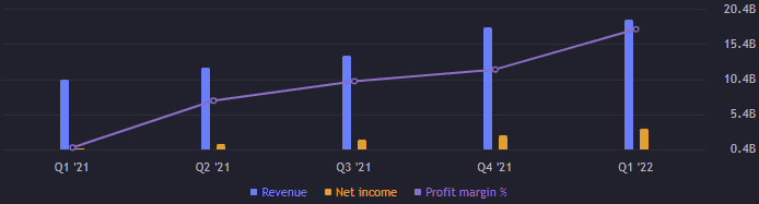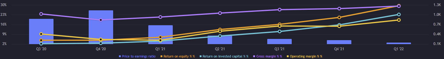 Zisk na akcii (EPS) je 2,86 bodů. Ukazatel P/E byl ke konci prvního čtvrtletí 146 bodů. Je to pořád hrozně vysoké číslo, ale za historii firmy se jedná o nejnižší úroveň, kde P/E bylo. Momentálně je P/E “pouhých” 103 bodů. Neboť od dubnového earnings cena markantně klesla. Rentabilita vlastního kapitálu (ROE) je více jak 29,4 %. Rentabilita na investovaný kapitál (ROIC) činí 23,17 %.