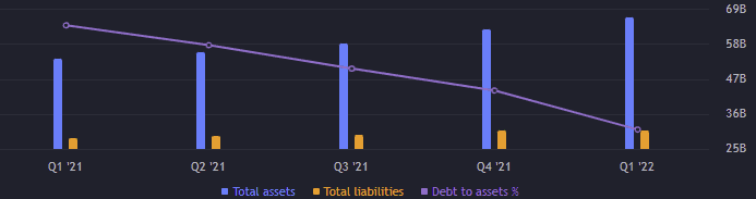 Poměr dluhu vůči vlastnímu kapitálu D/E je 0,11 bodů. Celkovýdluh je něco přes 7 miliard USD. Poměr dlouhodobého dluhu vůči celkovým aktivům je 0,08 bodů.