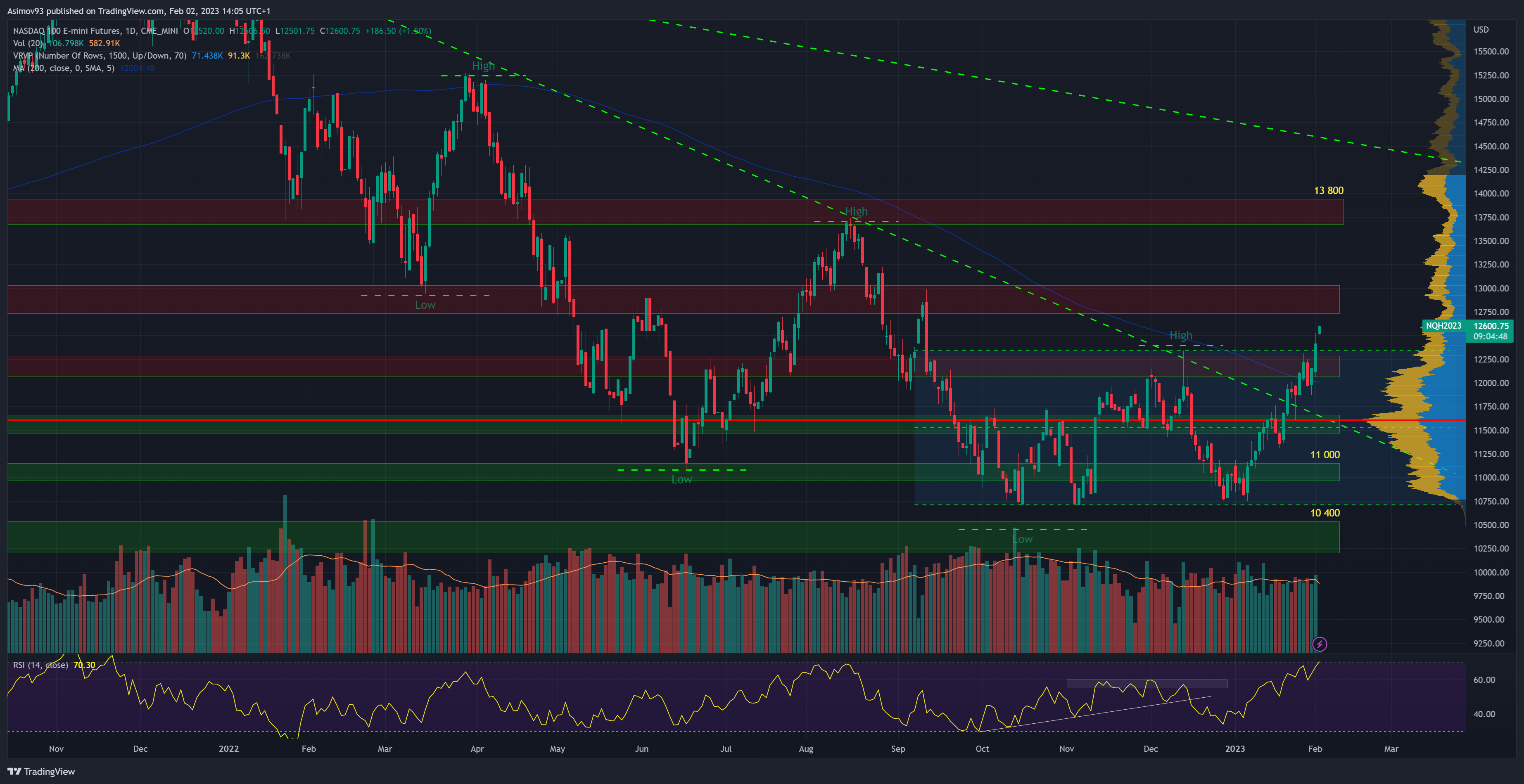 Takže akciový index S&P 500 má své low z října minulého roku na úrovni 3 500 bodů. On té doby de facto platí rostoucí trend, který se dost možná brzy potvrdí překonáním vrcholu z poloviny prosince. Nedávno se kurzu indexu podařilo překonat zakreslenou rezistenční linii, kterou kurz nedlouho poté i ze shora otestoval. Výsledek je evidentně pozitivní. Od té chvíle S&P 500 expanduje. A během tiskové konference, s předsedou Fed, se kurz vydal nad S/R levelem 4 100 bodů. Zároveň došlo k průlomu z té zakreslené stranové struktury.