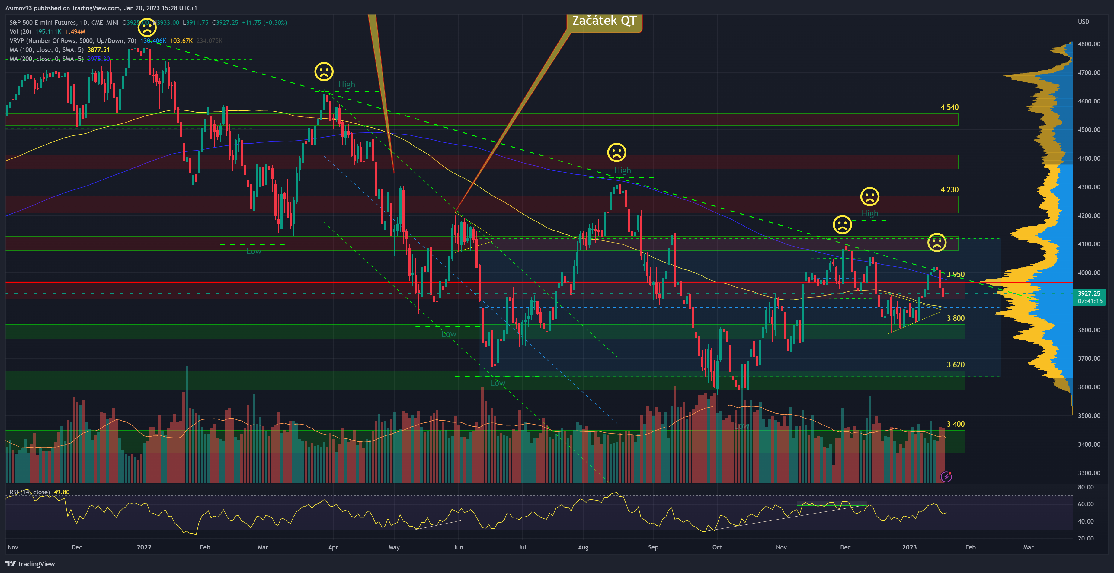 Delší stranový vývoj lze však i brát jako přípravu na mnohem větší pohyb. Buď tedy na změnu trendu na býka. Nebo přípravu na pokračování v rámci medvědího trendu. Uvedené se bohužel nijak nedá odhadnout dopředu. Jelikož do toho zasahuje příliš mnoho proměnných. Neznámě přesný vývoj inflace v roce 2023. Neznáme, jak přesně bude vypadat měnová politika Fed. A nevím, jestli se něco v ekonomice tzv. nerozbije.