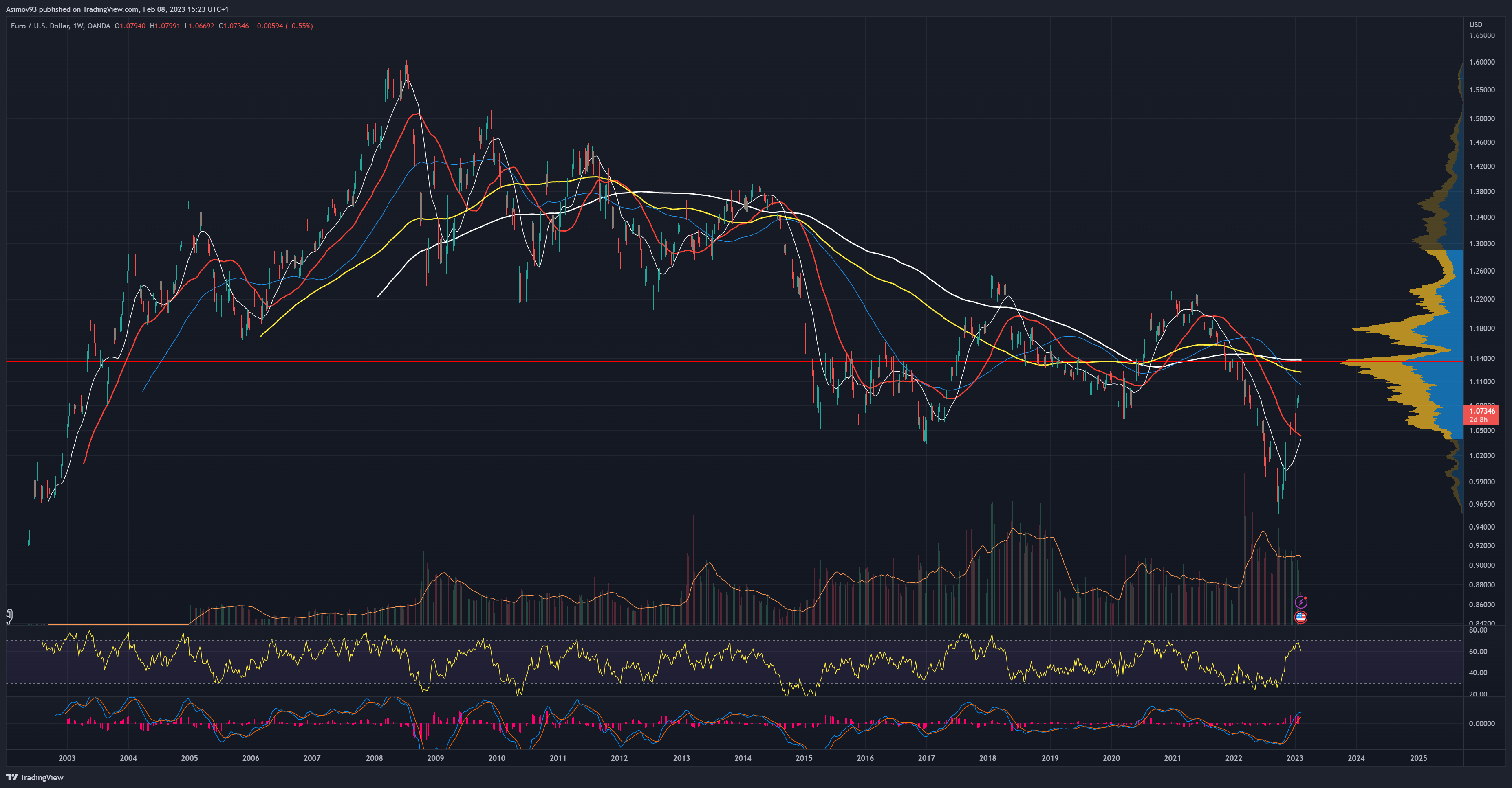 Prvně se podíváme na týdenní graf páru EUR/USD, kde chci ukázat, v jaké pozici se dolar vůči euru nachází. A za posledních 20 let je dolar vůči euru v jedné z nejsilnějších pozic. Což nakonec skončilo i tím, že došlo k paritě. A na omezenou dobu se tento pár obchodoval i pod paritou. Kdo by to býval dříve řekl?