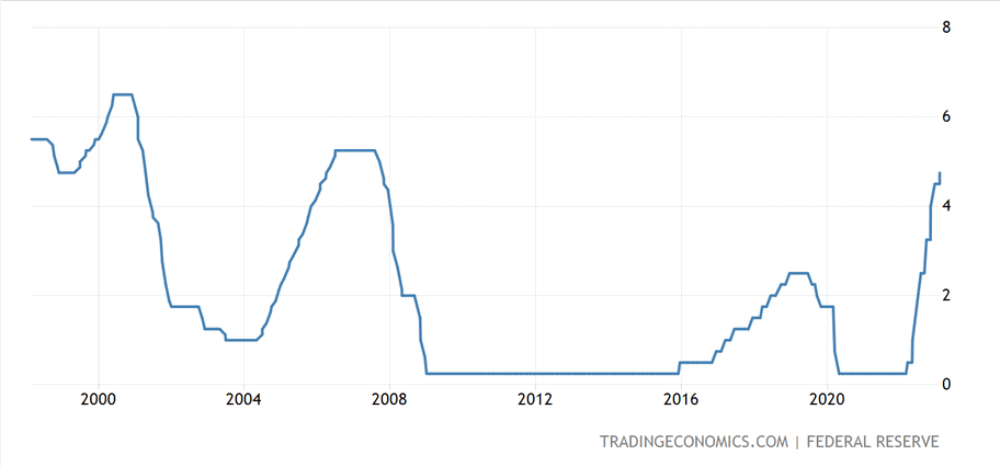 Americká centrální banka zvyšuje od března roku 2022 soustavně sazby. Z téměř nuly se do února úroková sazba dostala až na 4,75 %. Tak rychlý cyklus růstu úrokových sazeb Spojené státy nepamatují. Trhy věděly dlouho dopředu, že něco podobného musí přijít. A proto utahovaly měnové prostředí ještě před tím, než Fed začal základní sazbu navyšovat. Díky čemuž i americký dolar začal rychle posilovat již mnoho měsíců před prvním “hikem”.