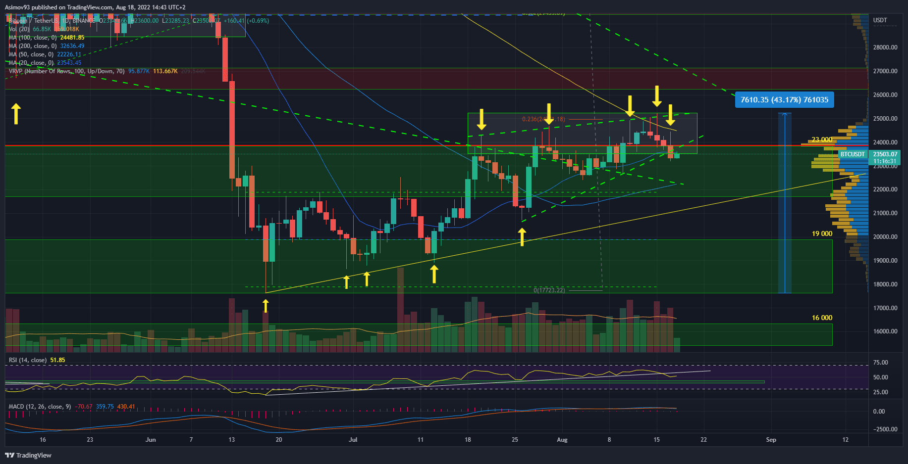 Po obou zamítnutích se sice trhu podařilo vzpamatovat a pokračovat v technickém uptrendu, ale momentum hodně zesláblo. Kurz se pomalu dostal zpátky nad 24 000 USD. Dokonce do těsné blízkosti 25 000 USD. Konkrétně se tak stalo 11. srpna. Nicméně přišlo třetí zamítnutí.