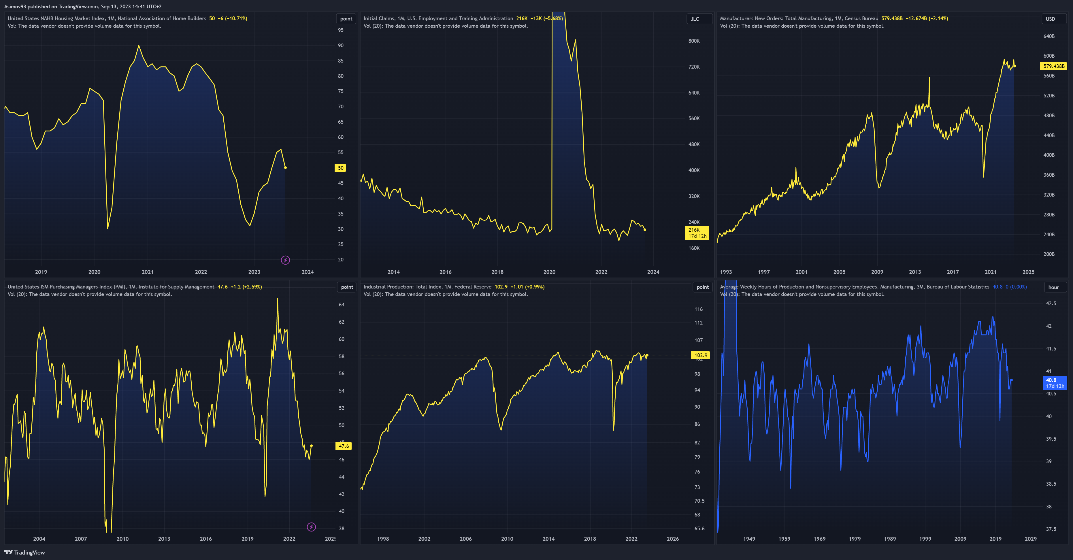 Na základě průmyslového indexu (industrial production) dochází od září 2022 ke stagnaci. Průměrná týdenní pracovní doba (average weekly hours) se nedokázala ani vrátit na úrovně před covidem. Na základě manufacturers new orders probíhá od dubna 2022 stagnace. Jediné co se drží, je trh práce. Ještě než samotná nezaměstnanost vzroste, prvně je nutné pozorovat rostoucí žádosti o pomoc v nezaměstnanosti (initial claims). Ty jsou však i v těchto chvílích na historických minimech.