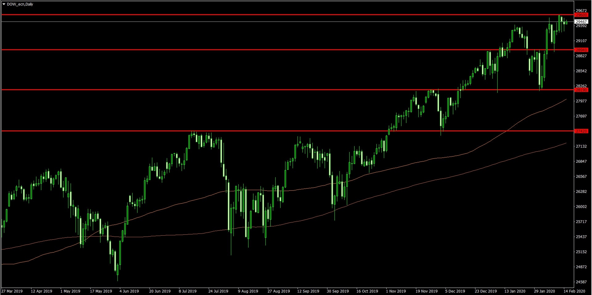 Dow Jones Industrial Average na denním grafu 17. 2. 2020